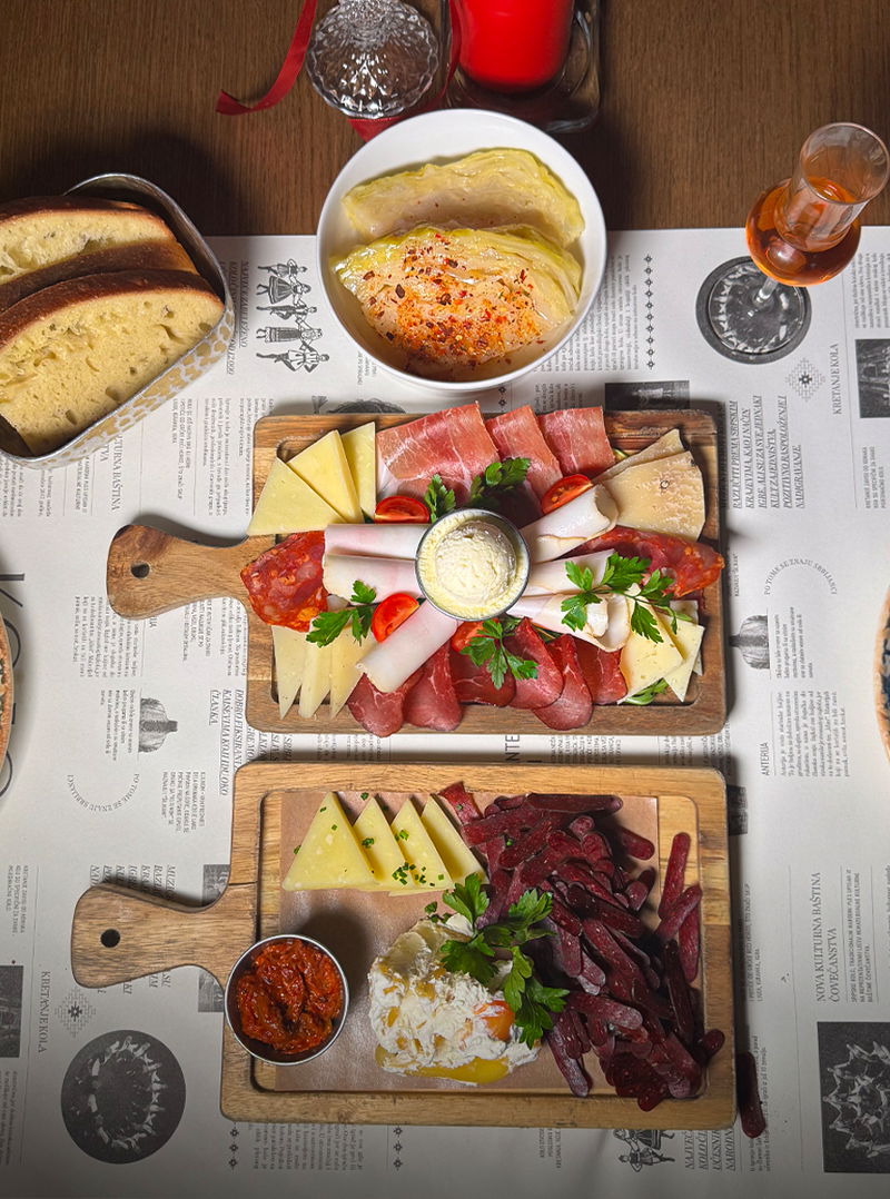2820Svinjska pršuta, , bela slanina, domaći kulen, govedja pršuta, mladi kajmak, Pirotski sir, koziji sir, sir sa tartufima, ovčiji sir, koziji sir sa biberom